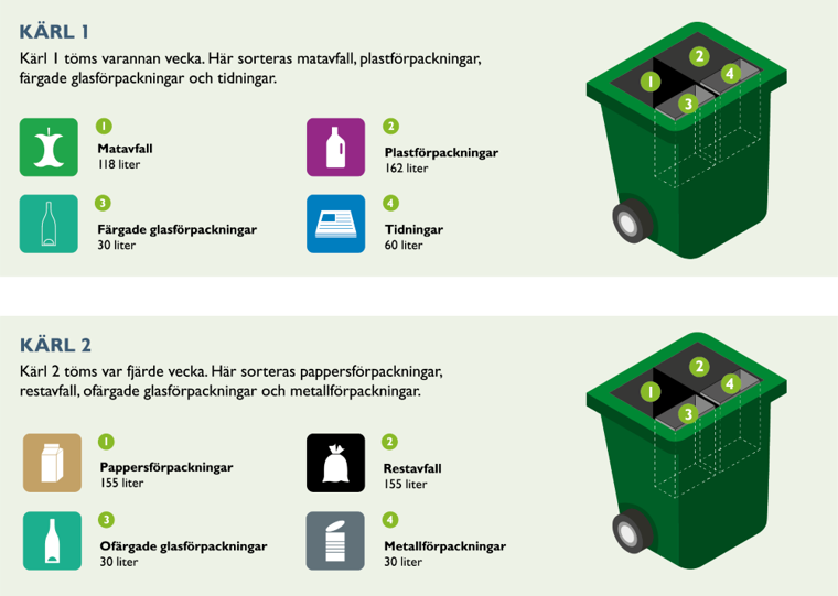 Kärl 2 innehåller: Restavfall (soppåsen) Pappersförpackningar Metallförpackningar Ofärgade glasförpackningar |