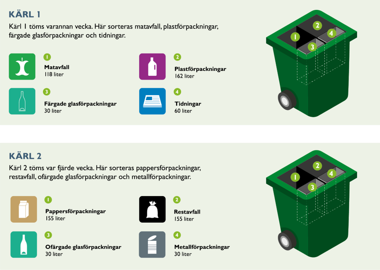 Kärlen innehåller fyra fack vardera, i kärl 1 sorteras matavfall, plastförpackningar, tidningar och färgade glasförpackningar. Kärl 1 töms varannan vecka.