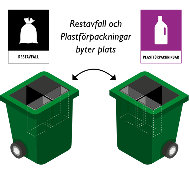 Restavfallet ska slängas i kärl 2 där plastförpackningarna tidigare slängts. Kärlet töms var fjärde vecka.