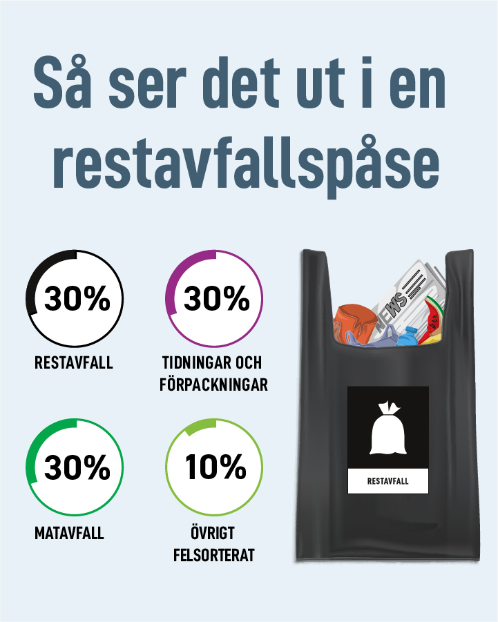 Restavfallet är det som blir kvar efter att du sorterat ut allt som kan sorteras ut för återvinning. Det som ska sorteras ut är matavfall och förpackningar samt allt som kan lämnas på återvinningscentral, som till exempel farligt avfall, trädgårdsavfall och textil.