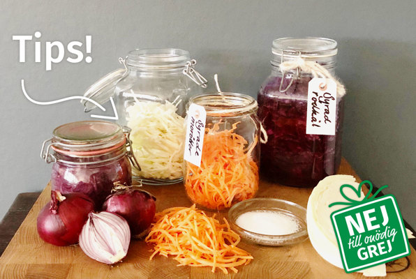 Ett bra sätt att ta tillvara på grönsakerna är att syra dem, speciellt all kål och rotfrukter som är i säsong under vintern. De syrade grönsakerna ger resterna av julskinka, rullsylta, och lax det där extra lyftet så det blir lättare att äta upp all julmat. Kom bara ihåg att börja i tid med din julklapp! Nedan följer ett recept som är enkelt att göra men kräver sin tid i burken. Är man mer otålig kan man pickla eller snabbsyra vinterns grönsaker i en 1-2-3 lag.