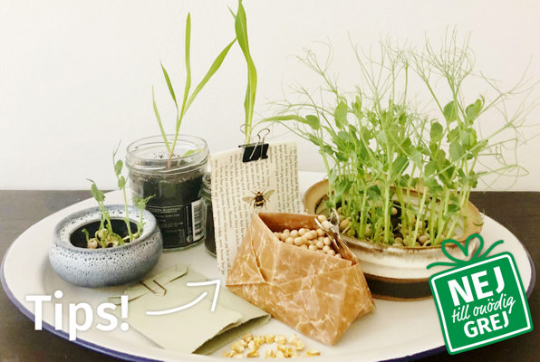 Du kan också förså några ärtor och ta med ärtskotten till födelsedagsbarnet. Fördelen med ärtskotten är att de inte behöver ner i jorden, utan de kan ligga uppe på jorden, så man ser först hur grodden kommer fram och drar sig ner mot jorden. Sedan kommer skottet som på bara en vecka vuxit klart för skörd. Låt fatet eller skålen med fröerna stå framme på bordet, barnen kan då själva skörda och lägga på sin tallrik.