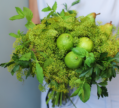 Fint i alla buketter är örter – plocka så du får så långa stjälkar som möjligt. Blanda persilja, dill, gräslök och oregano gärna när de blommar. Basilika, libbsticka, salvia – ja allt går att använda och är lätt för den som får buketten att ta tillvara på.