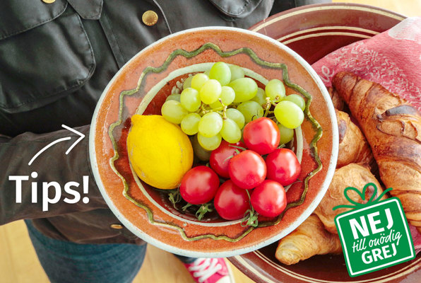 Alla blir glada av att få något som tillverkats med kärlek av givaren. Att köpa en hundraårig vackert glaserad keramikskål att överräcka godsakerna i kostar nästan ingenting och den fylls enkelt med eko-frukt, egenhändigt plockade vinbär från trädgården eller andra godsaker. Gott, enkelt och uppskattat. Mer miljövänligt kan det knappast bli. Keramikskålen kan sedan få fortsatt liv hemma hos mottagaren i form av exempelvis salladsskål, fruktskål eller vackert blickfång i köket.