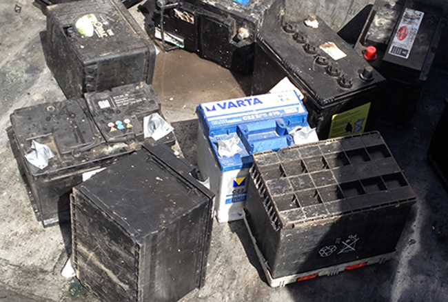 Bilbatterier och andra sorter av större blybatterier såsom moped-, MC-, truck- och lastbilsbatterier. Får ej innehålla: lithium.