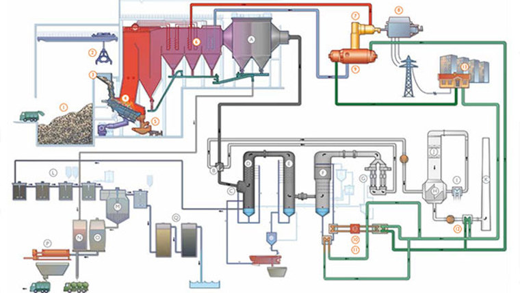 Vid förbränning av avfallet i pannan uppstår rökgaser som renas i flera steg med både torr och våt rening innan den släpps ut genom skorstenen.