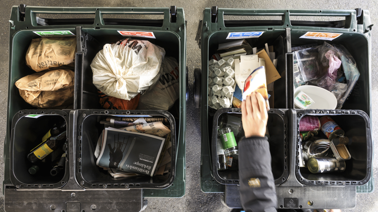 I de två kärlen kan du kasta matavfall, restavfall, tidningar, färgade glasförpackningar, plastförpackningar, pappersförpackningar, metallförpackningar och ofärgade glasförpackningar.