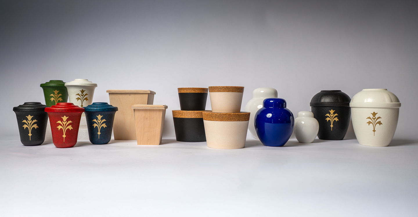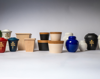 Vid separat kremering ingår en pappurna i priset, men vi har även urnor i keramik och pressad trämassa till försäljning.