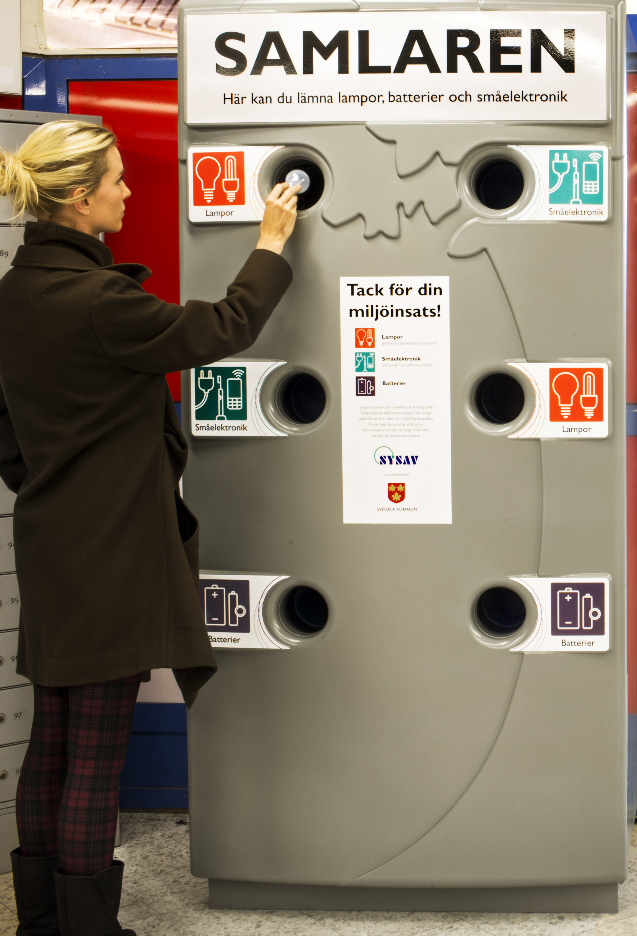 Samlaren gör det enkelt att samla in sådant som annars lätt skulle hamna i soporna, t ex glödlampor, lågenergilampor och batterier. Samhällsnyttan blir dubbel - dels hjälper vi till att avgifta kretsloppet från farliga ämnen och dels så återvinns värdefulla metaller som kan användas i produktion av nya varor.